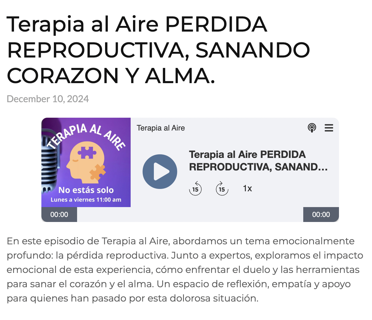 En este episodio de Terapia al Aire, abordamos un tema emocionalmente profundo: la pérdida reproductiva. Junto a expertos, exploramos el impacto emocional de esta experiencia, cómo enfrentar el duelo y las herramientas para sanar el corazón y el alma. Un espacio de reflexión, empatía y apoyo para quienes han pasado por esta dolorosa situación.